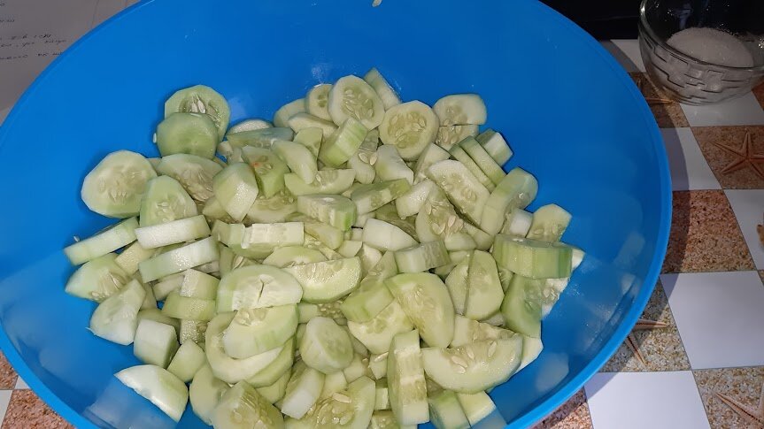 1,5 кг огурцов нарезаем кружочками толщиной в 1 см, добавляем 40 г соли, 50 г сахара, 50 мл 9 % уксуса, хорошо перемешиваем и добавляем 100 г кетчупа Чили, перемешиваем, оставляем на 2 часа для выделения сока из огурцов.