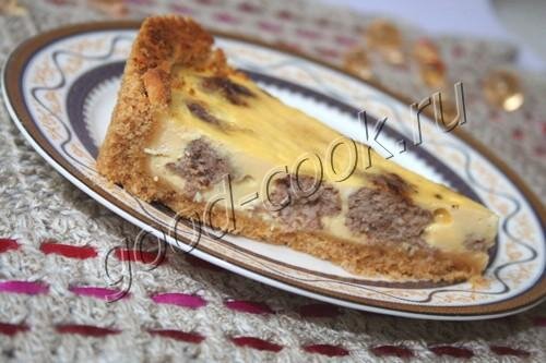 Интересный пирог. Рассыпчатая хрустящая корзинка с ароматом сливочного масла. И нежная суфлеобразная начинка, перемежающаяся мясными шариками.