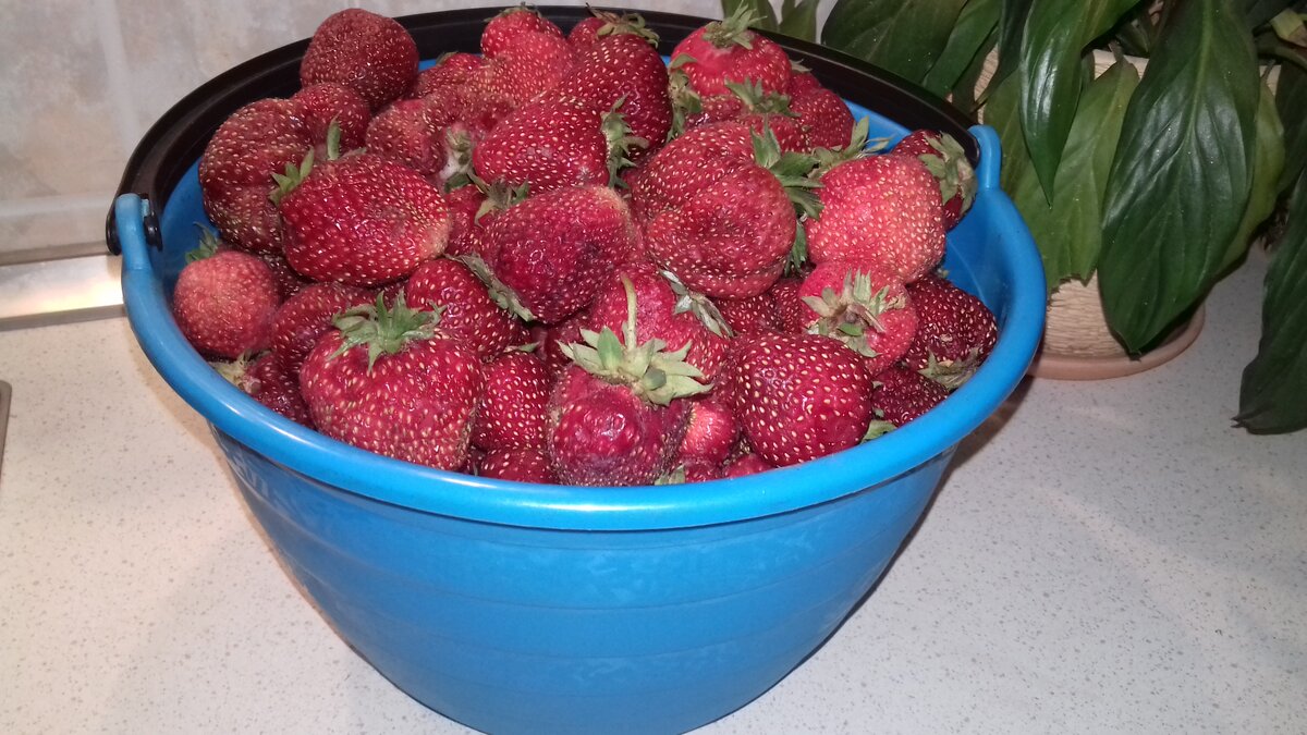 Пришёл июль и в месте с ним пришло время собирать первый урожай садовой клубники. А у любимой тёщи как раз с урожаем всегда всё в порядке. Собираем, и как водится, первым делом просто моем и едим, получая несказанное удовольствие и пользу от витаминов и минералов, коих в клубнике немало. Подробно о пользе клубники и содержании в ней витаминов и полезных веществ можно прочесть например в этой статье: https://kakievitaminy.ru/produkty/kakie-vitaminy-v-klubnike. А ещё я люблю в жаркую погоду размять ягоду в кружке, добавить немного сахара, залить холодным молоком и насладится этим восхитительным и ароматным кушаньем где нибудь в тени. А как практически без потери вкуса и полезных свойств заготовить клубнику на зиму? Есть такой способ! Итак, начнём. Ингредиенты: Клубника садовая - 2 кг Сахар песок - 2 кг. Для начала у ягоды нужно удалить плодоножку, перебрать на предмет мятых и подпорченных ягод (они не в коем случае не должны попасть в варенье, так как это значительно сократи