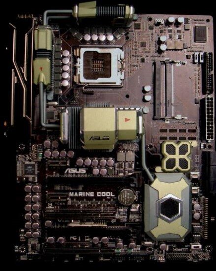 Речь идет о материнской плате Asus Marine Cool, концепция под названием marine cool была разработана специально для лучшего охлаждения и повышения стабильности работы материнской платы Плата выполнена в военном стиле , все компонент на плате идут строго в ряд , так же используется технология отведения тепла с помощью тепло-трубок и радиаторов , сейчас везде можно встретить тепло-трубки и массивные радиаторы на чипсете и цепях питания в современных премиальных материнских платах , но тогда в 2009 году эта технология только начинала набирать обороты . Данная материнская плата завоевала место в истории благодаря другой особенности , как вы уже заметили по фотографии на ней отсутствуют привычные слоты оперативной памяти DIMM , инженеры решили установить на плате слоты для размещения модулей памяти типа SO-DIMM , такая память обычно имеет более компактные размеры и используется в ноутбуках Обычно на материнских платах премиум сегмента находятся четыре слота и более под оперативную памят