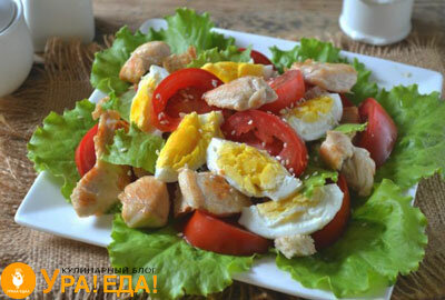 Самое интересное – сборка. На дно укладываем промытые листья, далее помидорки, сухари, нарезанные дольками яички и курицу. Для соуса смешаем сок лимона, горчицу и масло. Такой смесью польем салат, сверху оформляем кунжутом. Этих семечек нет в классической рецептуре, но они отлично сочетаются с остальными ингредиентами и добавляют салату нотку пикантности. Можно подавать самостоятельно или перед горячим.