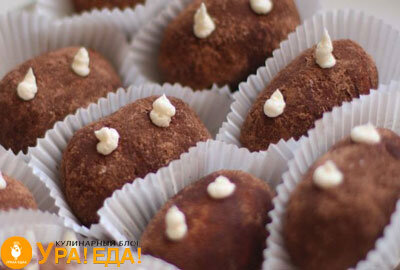 Сначала можно это делать ложкой, но потом лучше промесить руками, чтобы все было однородным. Делим тесто на 10-11 частей, из каждой формируем продолговатый шарик, похожий на картофельный клубень. Обваливаем в какао, чтобы ничего не таяло, можно смешать его с сахарной пудрой, а само пирожное предварительно охладить минуток 10 в морозильной камере. «Глазки» делаем из орешков или лепим из марципана.