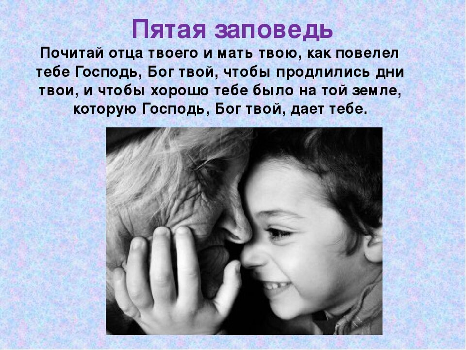 Вспомните, какая из заповедей Бога, данных Им для нас, немного отличается от всех остальных и как бы выделяется среди них тем, что является условием благополучия и долголетия? Да, это про родителей. «Почитай отца твоего и матерь твою, как повелел тебе Господь, Бог твой, чтобы продлились дни твои, и чтобы хорошо тебе было на той земле, которую Господь, Бог твой, дает тебе.» (Втор.5:16)