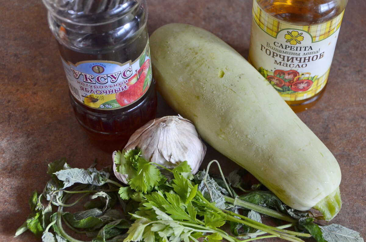 Изумительная закуска или гарнир к основному блюду. Причем эти кабачки хороши и свежеприготовленные, горячие, но еще вкуснее они становятся, постояв денек в холодильнике. Правда, нечасто они доживают до следующего дня. Продукты для маринования нам понадобятся самые простые - уксус, но не столовый, я люблю с делать с яблочным, но подойдет и любой фруктовый или винный. Мята, петрушка, кинза, чеснок и растительное масло - любое, без сильного аромата, у меня горчичное. Молодой кабачок или цукини нарезаем кружочками толщиной не более 1 см. На кабачок такого размера нам потребуется 10 -15 листиков свежей мяты (я еще добавила тройку листьев мелиссы), несколько веточек петрушки и кинзы, три средних зубчика чеснока, по 2 столовых ложки уксуса и масла, немного соли. Кабачки сбрызгиваем маслом и уксусом, добавляем мелко нарезанную зелень и чеснок и оставляем мариноваться на полчаса. Время от времени перемешиваем. Через полчаса отправляем кабачки на разогретую сковородку без масла - ведь оно и так
