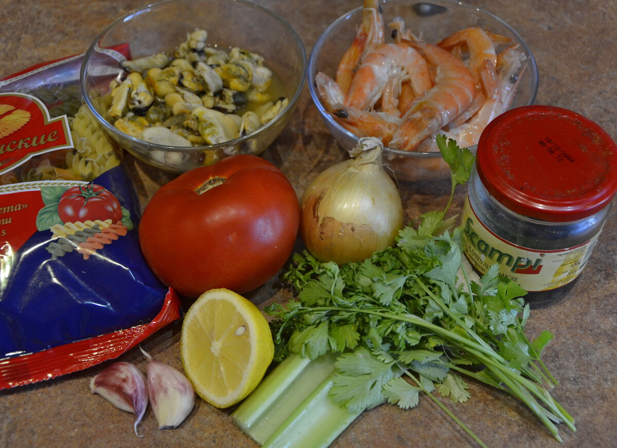 Очень легкое и вкусное блюдо, незаслуженно считающееся небюджетным. Так ли это? Учитывая, что я стараюсь укладываться в сумму 15000 рублей в месяц на троих взрослых, мы вполне можем себе его позволить. Да, не всегда бывают морепродукты по акциям, но когда цены снижаются, получается вполне приемлемо по цене. Давайте посчитаем. На фотографии все продукты, которые нам понадобятся. Плюс соль, перец и масло для жарки. Мидии варено-мороженые, покупала в Перекрестке по акции пару недель назад и отправила в морозилку до лучших времен. Более как на пасту, или в крайнем случае на салатик, они не тянут - ну, на мой взгляд, и зная вкус свежевыловленных мидий, просто так я их есть не буду. 150 рублей за полкило. Креветки тоже куплены в Перекрестке по 400 рублей за кг - взяла 700 г на 280 рублей. Но нам потребуются не все морепродукты, мидии и креветки я разделила на 3 части - так что 50 рублей мидии и 95 рублей креветки. 1 крупный помидор, около 180 г - пусть 18 рублей, лук, сельдерей, чесно