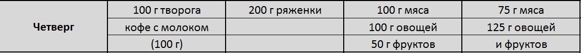 Итак, это становится уже приятной традицией – минус ещё один килограмм! За четыре дня четыре килограмма! Мне нравится так худеть! ))) По крайней мере, я вижу реальный результат! Сегодня у меня такое меню: Завтрак Начинаю привыкать есть творог! Оказывается, не так уж и плохо. ))) Хорошо, что сегодня аж 100 г кофе, да ещё и с молоком! Вообще-то я больше люблю чай. Обычно пила его по несколько раз в день. Около года назад отказалась от сахара, заменила его мёдом. Но поскольку чай я пила часто, то и мёда ела много. Так что толку от такой замены было немного. Сейчас чай можно пить между приёмами пищи – за полчаса до и после еды. Но мне почему-то больше нравится пить обычную воду. Наверно, организм сам подсказывает, что ему нужно. Второй завтрак Ряженка! Прямо бальзам для желудка! Да ещё 200 г! Кто не сидел на диете, тому не понять! ))) Обед Сегодня на обед я заменила куриную грудку на желудок индейки. Он не такой сухой и мягонький. С салатиком из помидорки и огурчика пупочки ушли на ура!
