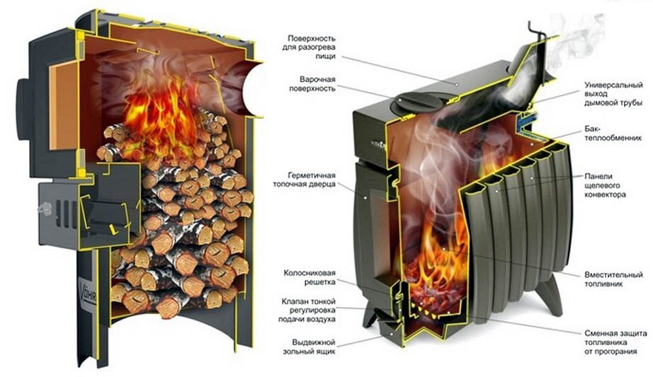 Есть различные модели, которые могут использоваться как для воздушного, так и для водяного отопления дома. К данному оборудованию есть возможность подключения емкости для нагрева воды, на нем можно готовить пищу, все будет зависеть от его схемы и модели.