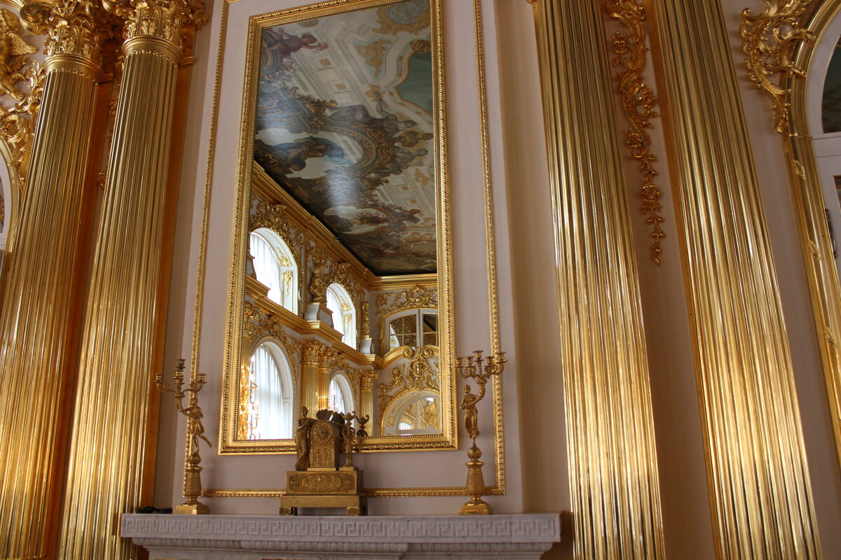 Анфилада комнат Екатерининского дворца называется Золотой, поскольку в ее оформление изобилует изящной позолоченной резьбой. Элементами, покрытыми матовым и глянцевым сусальным золотом оформлены дверные и оконные проемы, пилястры на стенах, бесчисленные скульптуры и множество зеркал. К слову, использование зеркал не только зрительно увеличивает и без того огромное помещение. В приемные дни отражение тысяч и тысяч свечей создавало непередаваемый эффект. Гости будто парили в окружении ослепительного сияния лучей льющегося ото всюду света. Сверкало и искрилось все – свечи, позолота, роскошная отделка зала и драгоценности приглашенных, создавая настоящую праздничную феерию. А что под позолотой? Как известно, золото – очень мягкий и эластичный металл. Его можно раскатать в лист, в 1000 раз тоньше человеческого волоса. Такое золото называют сусальным. Именно его использовали в оформлении Екатерининского дворца. А что же внутри? Вся, без исключения, резьба – пилястры, пухлые амуры и стройные