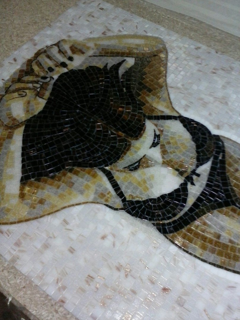 2 часть "Здесь не будет фото раздетых женщин!" Обрежем лист ДВП с небольшим запасом (сантиметра по 3-4 по всем краям), и разведя затирку из расчёта 1,5-1,7 кг на квадратный метр как можно быстрее размажем её по выбеленной части. Внимание: точные электронные весы и строительный фен - два самых главных инструмента мозаичника, всё остальное можно сделать и руками с фИговыми листочками в них. Весы нужны для отмеривания точных пропорций компонентов А и В эпоксидной двухкомпонентной затирки. Для чего нужен фен - расскажу в какой-нибудь другой раз. Желательно использовать для этого волнообразный шпатель с высотой волны 3 мм под наклоном градусов в 60-70. Стараемся максимально смочить поверхность эпоксидкой и не допускать пропусков или наоборот, излишней высоты волн. И уже после этого взяли измазанный лист ДВП, перевернули его, нацелили хорошенько, да и пришлёпнули на эту бедную плохо одетую женщину. Одним точным приемом накрыли её. Да ещё руками прижали и провибрировали как