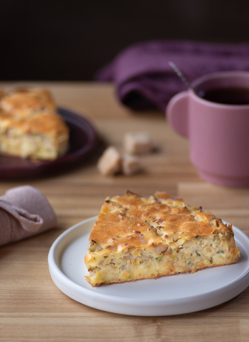Вкусная и быстрая выпечка для пикника или чаепития на даче. Во-первых, пирог получается очень вкусным и нежным – в нашей семье его «сметают» за один присест, «на вечер» или «на завтра» ещё ни разу не осталось. Во-вторых, он очень просто и быстро готовится. Самое сложное во всем процессе – обжарить капусту для начинки. А тесто даже раскатывать не нужно! Рецепт, конечно, не новый – еще наши мамы и бабушки в советские времена готовили такие «заливные» пироги, что нисколько не уменьшает его ценность.