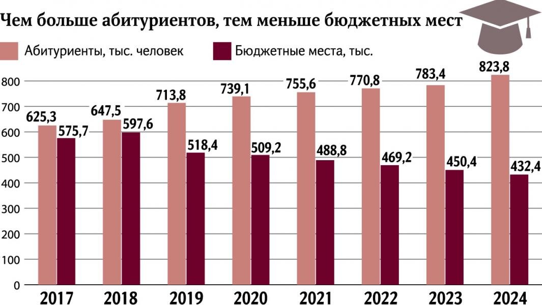 В докладе [правительства — Федеральному собранию о политике в сфере образования] представлен прогноз суммарной численности выпускников школ и иностранных абитуриентов и контрольных цифр приема на бюджетные места по годам до 2024-го. Из него следует, что последний показатель в 2017 году составлял 575,7 тыс. мест, затем он вырос до 597,6 тыс. и к 2019-му снизился до 518,4 тыс. В 2020 году прогнозируется его дальнейшее снижение на 2% и далее на 4% ежегодно — до 432,4 тыс. бюджетных мест в 2024-м.