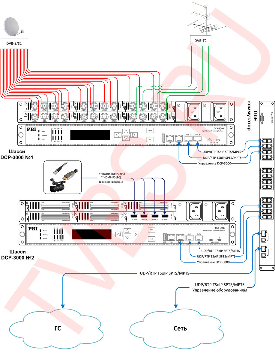 Для получения контента в форматах DVB-T/T2 и DVB-S/S2, кодирования/транскодирования, мультиплексирования и последующей передачи используется профессиональная модульная головная станция DCP-3000. В каждое шасси возможна установка до 6ти функциональных карт расширения. Первое шасси DCP-3000MF с картами расширения D01S2 и D01T2 рассчитано на прием 20 спутниковых транспондеров, 4х plp групп мультиплексов эфирного цифрового телевидения и передачу принятых потоков через 2*GbE порта на второе шасси для дескремблирования и обработки. Второе шасси принимает UDP/RTP потоки от первого шасси, а также из любых других источников в IP сети на 2*GbE порта и снабжено пятью картами-дескремблера P01CI с 4-мя CI слотами в каждой карте и картой кодера P01EC или P02EC в зависимости от требуемых входных интерфейсов. При необходимости карты P01EC и P02EC могут использоваться как четырехканальный транскодер MPEG-2 в MPEG-4 или наоборот. Каждое шасси DCP-3000MF занимает в стойке высоту в 1RU. Шасси DCP-3000MF поддерживает горячую замену как блоков питания для резервирования по питанию, так и всех карт расширения. Без карт расширения шасси представляет собой многофункциональный IP-IP процессор и ремультиплексор.