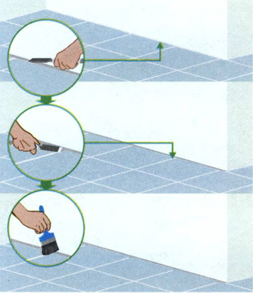 Старой стамеской зачищаем угол между стеной и полом до основания. Углубляем швы между плитками не дальше 30 мм от стены. Убираем мусор из канавок и наносим грунтовку.