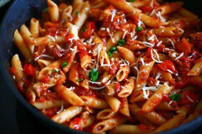 - В это время в подсоленную кипящую воду погружаем пенне ригате и варим до готовности. Сливаем воду, высыпаем их в готовый соус, оставляем на минуту.