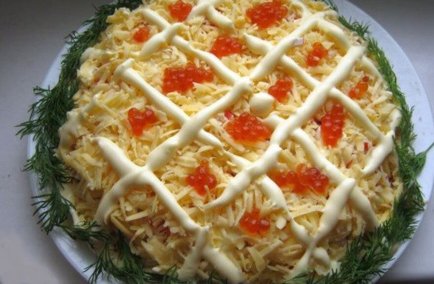 В данном рецепте мы рассмотрим один из вариантов царского салата с красной икрой, кальмарами и крабовыми палочками. 1. Картошку помыть и сварить в мундирах. Клубням дать остыть и очистить их. Его покрываем крупной сеткой майонеза, а получившиеся ячейки заполняем оставшейся красной икрой. По бокам, в виде украшения, можно уложить веточки зелени.