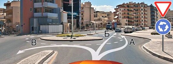 Перед нами круговое движение и есть 3 направления. Траектория В - это явное нарушение, т.к. будет осуществлен выезд на встречку. при выезде на кольцо мы будем поворачивать направо. При повороте направо мы должны держаться ближе к правой полосе, согласно п.п. 8.6.