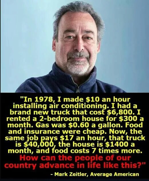 1. Марк Зейтлер, «средний американец», жалуется на изменения к худшему. «В 1978 году за установку кондиционеров мне платили 10 долларов в час. У меня был новый грузовичок, который стоил $6'800. Я снимал дом с двумя спальнями за $300 в месяц. Бензин стоил 60 центов за галлон. Еда и медстраховка были дешёвыми.