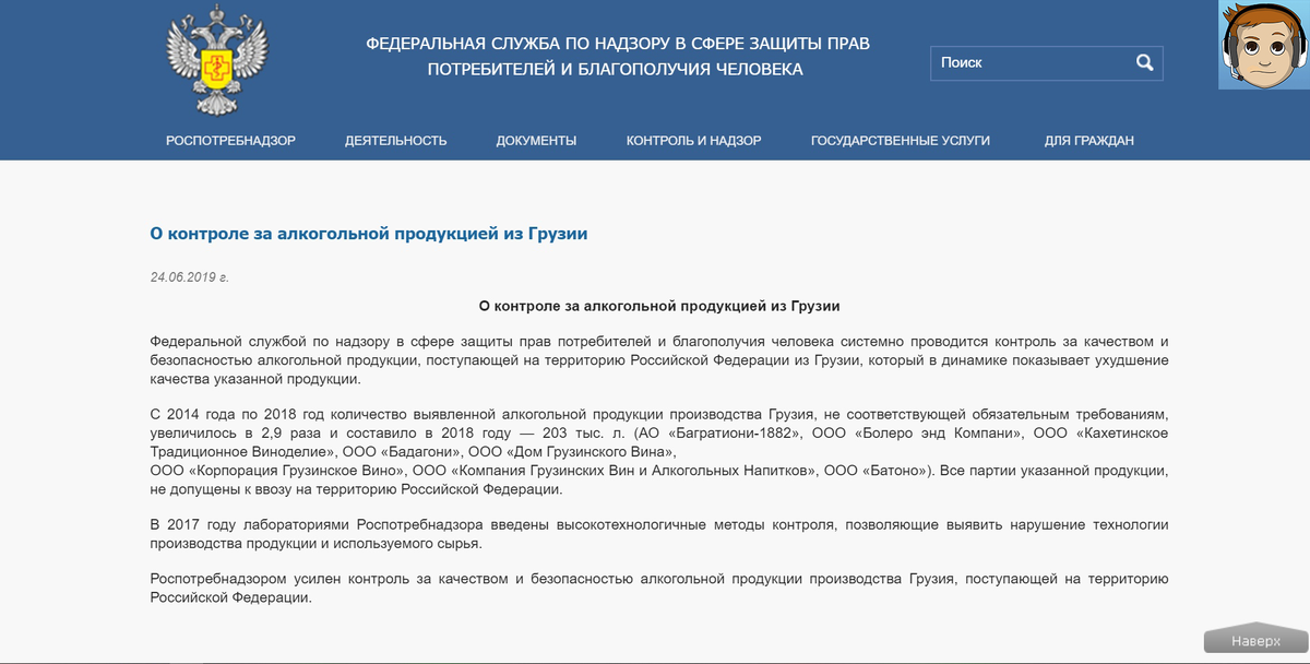 Сегодня Роспотребнадзор на своём сайте сообщил, об ужесточении контроля за качеством Грузинской алкогольной продукции. Обосновав этой небольшим отчетом, по данным службы начиная с 2014 года по 2018 качество продукции только ухудшалось. За эти четыре года, Роспотребнадзор в заметил, что качество продукции упало почти в три раза. Дмитрий Песков-"Решение усилить контроль за качеством грузинского алкоголя не связано с мерами по обеспечению безопасности своих граждан в Грузии" Напомню, что, именно 21 июля начались массовые протесты в городе Тбилиси. Народ на улицах требует проведения досрочных парламентских выборов. И люди добились того, что хотели- теперь выборы пройдут по пропорциональный системе. Грузия постоянно пытается выдвинуть Россию виноватой, то в 2006 году когда наложили арест на их продукцию, они заявили, что это специальная Российская диверсия. У меня нет слов это комментировать. Поводом для беспорядков и митингов послужил визит российских депутатов в Грузию, а именно посту