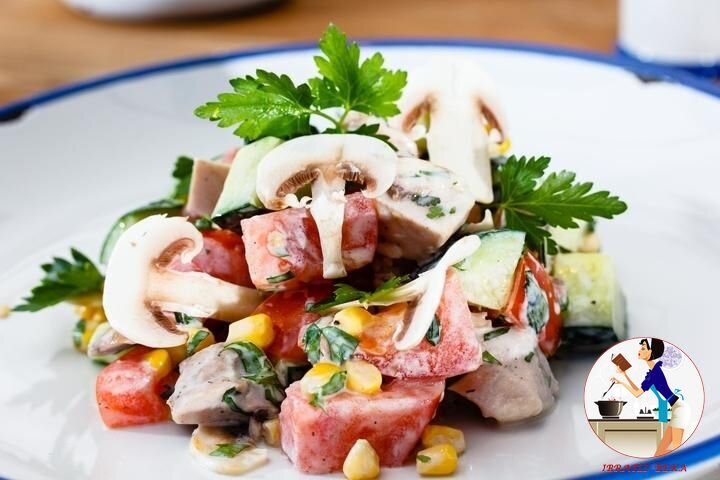 Tovuq ko'kragi qo'shib tayyorlangan salatlar doimo katta talabga ega va ko'p kalloriyaga ega bo'lmaydi. Aziz bekajonlar e'tiboringizga shunday kam kalloriyali va vitaminlarga boy salat retseptini taqdim etaman. Salatning tayyorlanishi oddiy, hech qanday noyob masalliqlardan emas balki, oddiy hamyonbop masalliqlardan foydalanilgan. Retseptni saqlab qolishni unutmang! Kerakli masalliqlar: 1/2 dona tovuq ko'kragi 1 dona bodring 1 dona pomidor 3-4 osh qoshiq makkajo'xxori konservasi bir hovuch shampinon 1 dona limon 4-5 osh qoshiq tabiiy yogurt 2 dona shoxchadan petrushka va rayhon ta'bga ko'ra tuz va murch Tayyorlash usuli: 1. Birinchi navbatda salat uchun zapravkani tayyorlashga kirishing. Buning uchun: limon sharbatini siqib tabiiy yogurtga qo'shing. Ta'bga ko'ra tuz va murch solib aralashtiring. Qolgan masalliqlar tayyor bo'lgunga qadar chetda qoldiring. 2. Qaynatilgan tovuq ko'kragini kichik to'rtburchak shaklda to'rg'ang va tog'orachaga soling. 3. Makkajo'xori konservasini sharbatida