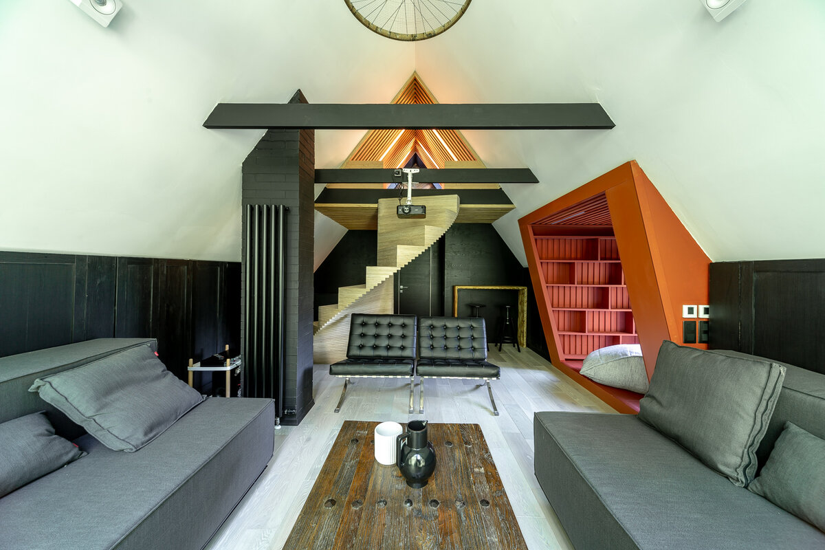 Вместо пожелтевшей вагонки стены мансарды украсила монохромная графика, разбавленная терракотовым кубом библиотеки. Такой прием – фирменная фишка Алексея Аладашвили, отлично работающая даже в таких сложных многоуровневых пространствах.
