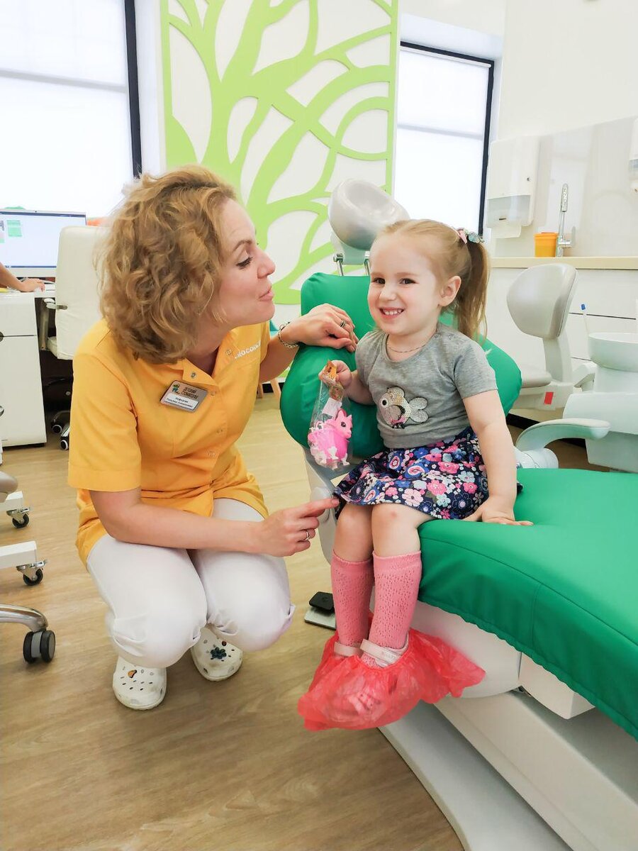 Детская профессиональная гигиена происходит в игровой форме, мягкой нераздражающей щеточкой и приятной на вкус пастой. Профессиональная чистка позволяет снять все зубные отложения с поверхности эмали молочных зубов, не повреждая и не царапая ее. Как происходит сама процедура: Сначала полость рта изолируют специальной детской резиновой защитой ( OptraGate Junior), которая позволяет защитить губки и щечки малыша от лишних прикосновений инструментов и создает доступ доктору ко всем поверхностям зубов. Межзубные промежутки очищают специальной стоматологической нитью- флоссом . Процедура абсолютно безболезненна, не продолжительная по времени и почти не причиняет дискомфорта малышу. После проведённой гигиены на зубки наносят реминерализирший препарат, укрепляющий эмаль зубов и защищающий от кариеса. Вовремя проведенная детская гигиена позволяет предотвратить появление многих стоматологических заболеваний. Запишите своего ребенка к нам на детскую профессиональную чистку и будьте уверены в