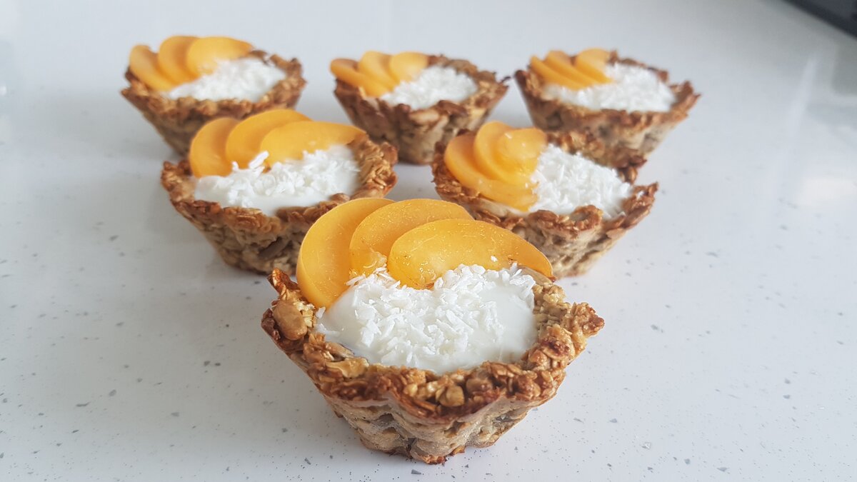 ПП десерты тоже могут быть вкусными и красивыми. Простой и быстрый десерт с фруктами. Если Вы в процессе похудения или просто следите за тем, что едите - это не повод отказываться от сладостей и вкусняшек. Заменяйте фрукты по вкусу или настроению и такие корзиночки буду радовать вас на завтрак, перекус или как десерт к чаю. Список продуктов для 6 корзиночек. Для основы: Хлопья овсяные - 70 гр Семечки подсолнуха - 40 гр Яйцо - 1 шт Мёд - 1 ч.л. Для начинки: Абрикосы - 3-4 шт Желатин - 4 гр Вода - 30 мл Йогурт - 100 гр Мёд - 1 ч.л. Процесс приготовления по шагам. 1. Для корзиночек в чаше смешать хлопья овсяные, семечки подсолнуха, яйцо и мёд. 2. Всё тщательно перемешать и выложить в формочки для выпечки. При необходимости формы смазать растительным маслом. Пальцы смачиваем в воде и распределяем массу по формам, придавливая и поднимая края. Выпекать при 180 градусах 10-15 минут. Края корзиночек слегка станут золотистыми. Готовые корзиночки сразу достать из духовки и дать остыть, после