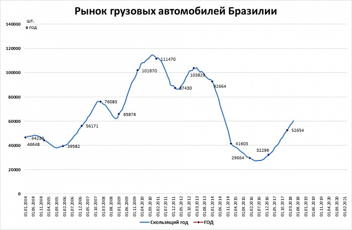 Грузовики - инвестиционный товар. А значит рынок грузовиков - хороший показатель экономической конъюнктуры. Поэтому в этом блоге публикуются данные по рынкам тяжёлых грузовиков России и крупнейших стран мира. По Бразилии картинка выглядит так. Рынок растёт и превысил отметку 60 тыс. штук за 12 месяцев.