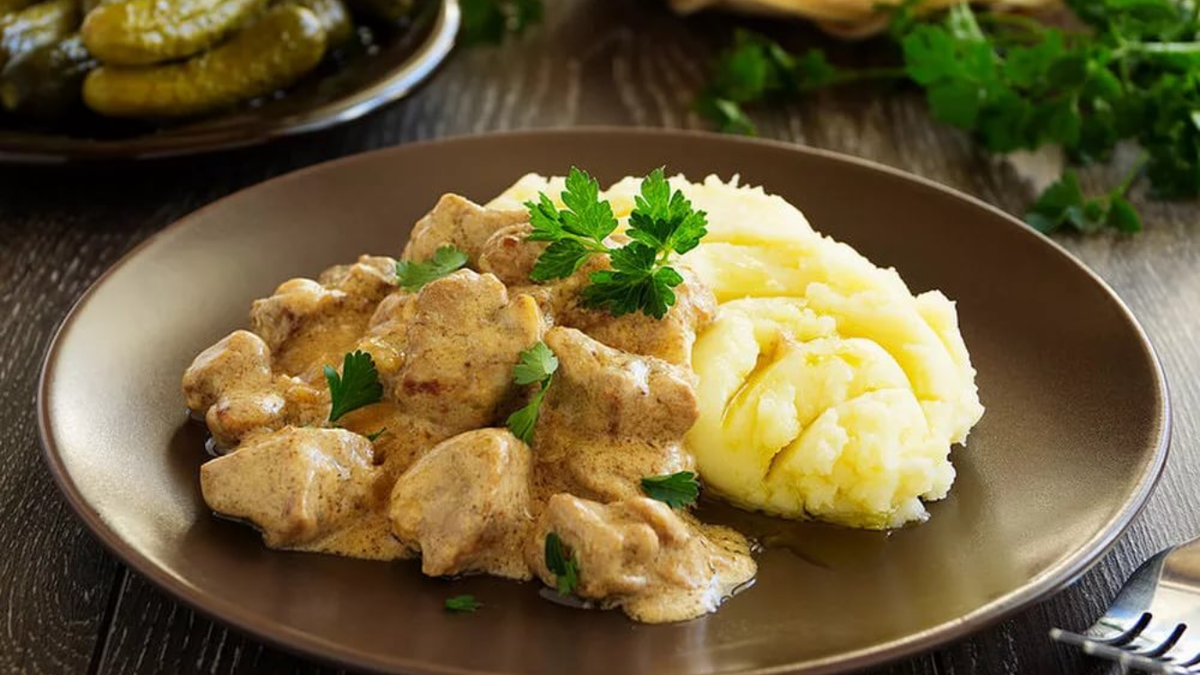 Добрый вечер дорогие друзья очень очень захотелось поесть картофельное пюре с мясом и тут в голове только бефстроганов, это знаменитое французское блюдо которое конечно же готовиться только с говядиной, но я решил приготовить бефстроганов с куриной печенью, в печенке содержится очень много витаминов и если вы до сих пор не включили ее в свой рацион, то поторопитесь ( вкусное , нежное и очень полезное ), и так что на понадобиться: печень куриная 0,100 лук репка 0,050 сметана 0,050 куриный бульон 0,100 сливки 33% 0,100 масло раст 0,010 для пюре: картофель очищенный 0,150 масло слив. 0,30 сливки можно не жирные 0,050 и так дорогие друзья нарезаем лук и печень соломкой, разогреваем сковороду добавляем растительное масло, на растительном масле начинаем обжаривать лук пока без печени, так как печень готовится очень быстро,лук обжариваем до золотистого цвета и добавляем печень обжариваем до небольшого коллера ( корочки ), и заливаем бульон, прогреваем и добавляем сметану и сливки перемешиваем