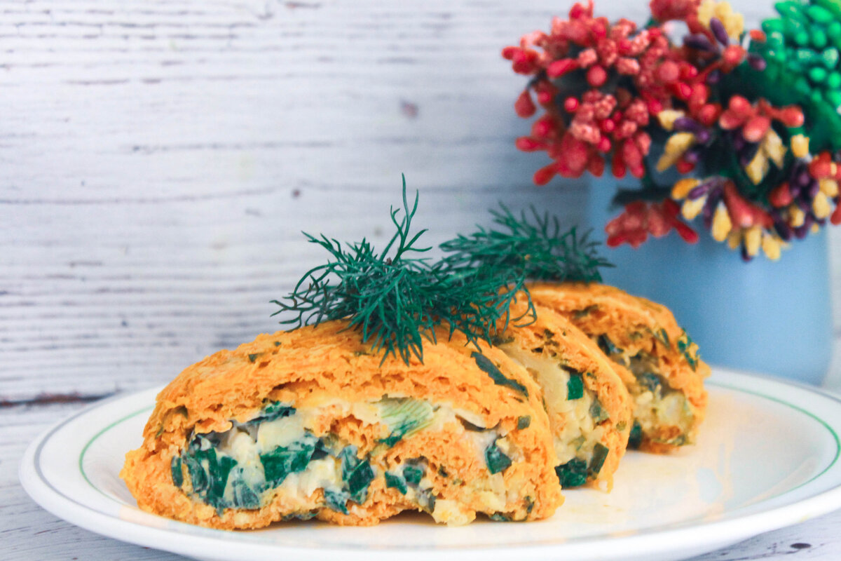 Неожиданно вышло очень вкусно. Ингредиенты: Морковь - 0,5 кг Яйцо - 3 шт. Соль Перец Растительное масло для жарки Для начинки: Зеленый лук Зелень - по вкусу Твердый сыр - 2 ст.л. Майонез для заправки Приготовление: 1. Морковь очистить и натереть на мелкой терке Обжарить на масле и откинуть на дуршлаг. Зелень измельчить Отделить белки от желтков. Белки взбить в пену 2. Морковь перемешать с желтками и зеленью Потом добавить белки, соль, перец и перемешать. 3. Полученную массу выложить на выстланный пергаментной бумагой противень и выпекать 15 минут в духовке при 180 градусах. 4. Для начинки: Зелень порубить Сыр натереть на крупной терке Смешать зелень и сыр, заправить майонезом и перемешать. Начинку выложить на морковный корж Свернуть в рулет. после нарезать кусочками и можно подавать к столу.