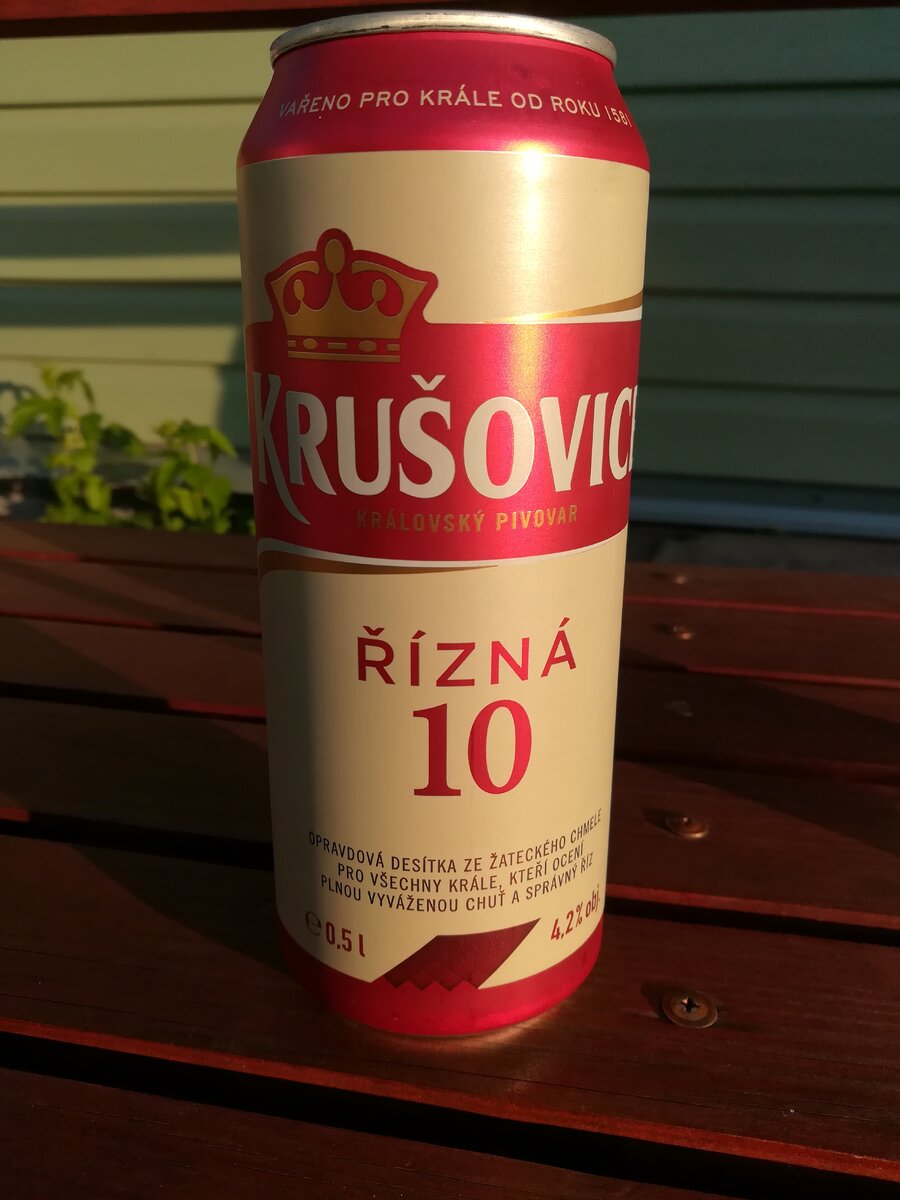 Всем привет! В субботу были с женой на даче, в гостях у моих родителей. В эти выходные в центральной части России была ужасная жара. Столбик термометра в тени показывал +34°C. От жары спасались как могли: купались в речке, пили домашний холодный квас. К вечеру решил сходить в Магнит и взять пивка, благо температура воздуха пошла на убыль. Увидел новинку - пиво Krušovice Rizna 10. В магазине пиво было по акции - 99 рублей. Поэтому взял две баночки на пробу. Импорт все-таки. Состав: вода, солод ячменный, хмель, экстракт хмеля. Описание: Производитель: пивоварня "Heineken", Чехия
