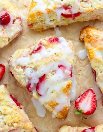 Наступил сезон клубники и сразу возникает желание испечь какую нибудь вкуснятину. Обожаю клубнику в любом виде. Мне понравился этот рецепт тем, что булочки получаются не сухие, слегка маслянистые, ароматные и наполненные ягодами. Как - то мне попался рецепт этих замечательных булочек. Сливочные булочки получаются нежные с «разрывающейся» свежей клубникой в каждом куске. Подавать их следует теплыми с дополнительной глазурью. Или взбитыми сливками. Это идеальный рецепт для доброго утра! На подготовку уходит 10 мин, на приготовление 20 мин. Эти булочки очень легко приготовить и используются простые ингредиенты. Ингредиенты для клубничной булочки: Мука – 2,5 стакана; Соль – ½ чайной ложки; Разрыхлитель – 2 чайные ложки; Сода пищевая – ½ чайной ложки; Сахар – 1/3 стакана; Сливочное масло – 4 унции; Яйца – 1 большое; Молоко – ½ стакана; Жирные сливки – 2 столовые ложки; Клубника нарезанная на четвертинки Сахарная пудра для ванильной глазури. Для глазури: Жирные сливки – 2 столовые ложки;