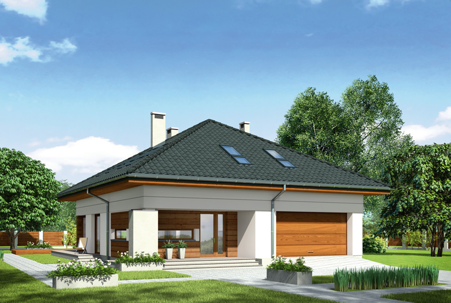 Интересное предложение для семьи, которая хотела бы жить в полном неоспоримом очаровании и в то же время очень функциональном здании. Кирпичный блок в этом случае был спроектирован по плану квадратной формы и покрыт шатровой крышей. Эта стройная, стильная форма обогащена двумя аркадами, в задней части здания также есть просторная терраса. Одним из преимуществ здания является большой двухместный гараж. Заслуживают внимания элегантные фасады, отделанные натуральными материалами. Пройдя порог дома мы окажемся в коридоре. Отсюда вы можете попасть в большой гараж с котельной сзади. Это просторная комната, поверхность которой позволяет использовать котел для любого вида топлива, ее преимуществом является также выход, ведущий прямо на улицу, к террасе. Выйдя из прихожей и направляясь к жилой части, мы окажемся в холле. Здесь справа находится кладовая. Её расположение окажется очень удобным в повседневном использовании, поскольку позволит быстро перенести покупки. На противоположной сторон