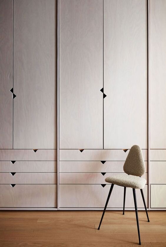 Сейчас «раскручен» тренд использования врезных ручек, но он стал настолько массовым, что хочется чего-то новенького. Идея: используйте разные формы врезных ручек, не ограничивайтесь стандартными прямоугольными. Другая идея – использование фанеры в качестве основного материала. Фанеру в интерьере легко можно обыграть и получить актуальный дизайн на долгие годы, например, как на этом фото.