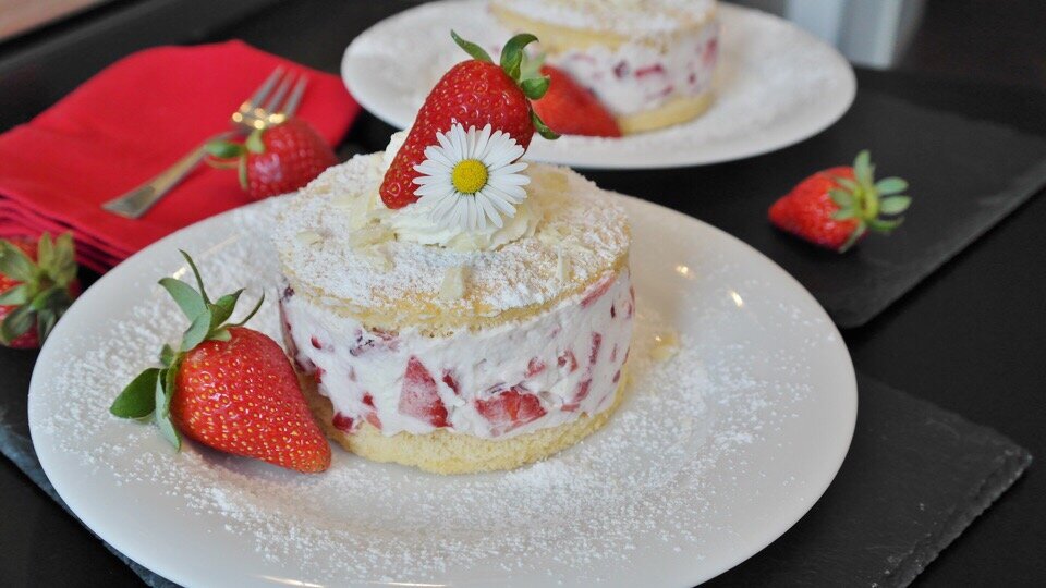 2. Ягоды, мы берем клубнику, нарезаем маленькими кусочками. Достаем разъемную форму для выпечки и начинаем выкладывать слои: батон первым слоем выкладываем на дно формы так, чтобы не оставалось свободного места, следом обильно смазываем кремом и посыпаем кусочками ягод. Так повторяем до тех пор, пока не закончатся ингредиенты. Внимание: 4 ст. л. крема оставьте. Последний слоем должен быть выложен батон и слегка пропитан кремом. Ставим тортик на 6-8 часов в холодильник.