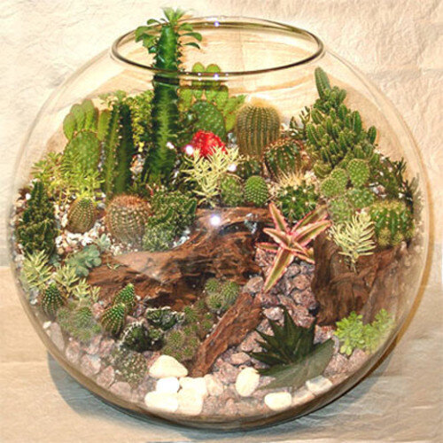 У вас дома есть флорариум? Если нет, очень рекомендую завести - это не просто очень красиво, это еще и интересно! Флорариум сделать совсем несложно, особенное если он так называемого "открытого типа" - для этого можно использовать обычный аквариум, просто подобрав для него правильные растения. Проще всего выращивать во флорариуме суккуленты и кактусы - они неприхотливы, не требуют частого полива, нетребовательны к почве и нормально переносят всякие катаклизмы. Однако многие другие цветы чувствуют себя во флорариумах ничуть не хуже, растут, выпускают новые побеги и прекрасно цветут - карликовые орхидеи, фуксии, бегонии и фиалки. Кстати, миниатюрные фиалки замечательно выглядят и превосходно себя чувствуют в любых флорариумах и закрытых ,и открытых. Это неприхотливый и очень красивый цветок, который имеет огромное количество самых разных оттенков. Секрет выращивания цветов в стеклянных емкостях довольно прост - на дно нужно насыпать дренаж (это обязательное условие), затем слой крупног