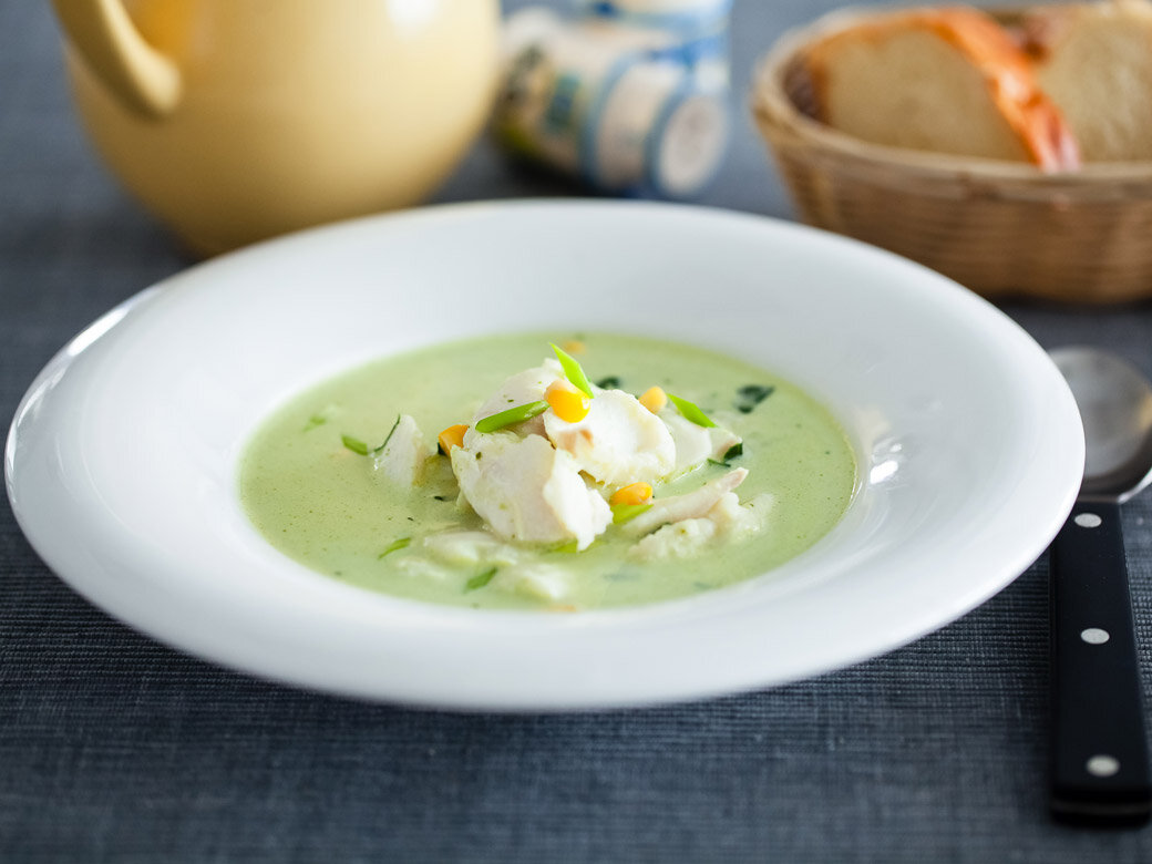 Разогреть в чаше мультиварки оливковое масло, добавить измельченную зелень, готовить в режиме «Мой рецепт plus (мультиповар)» 5 минут при температуре 160° С, затем добавить чеснок и картофель. Готовить под крышкой в том же режиме 10 минут при температуре 140° С. Влить рыбный бульон и варить в том же режиме 10 минут. Шаг 5