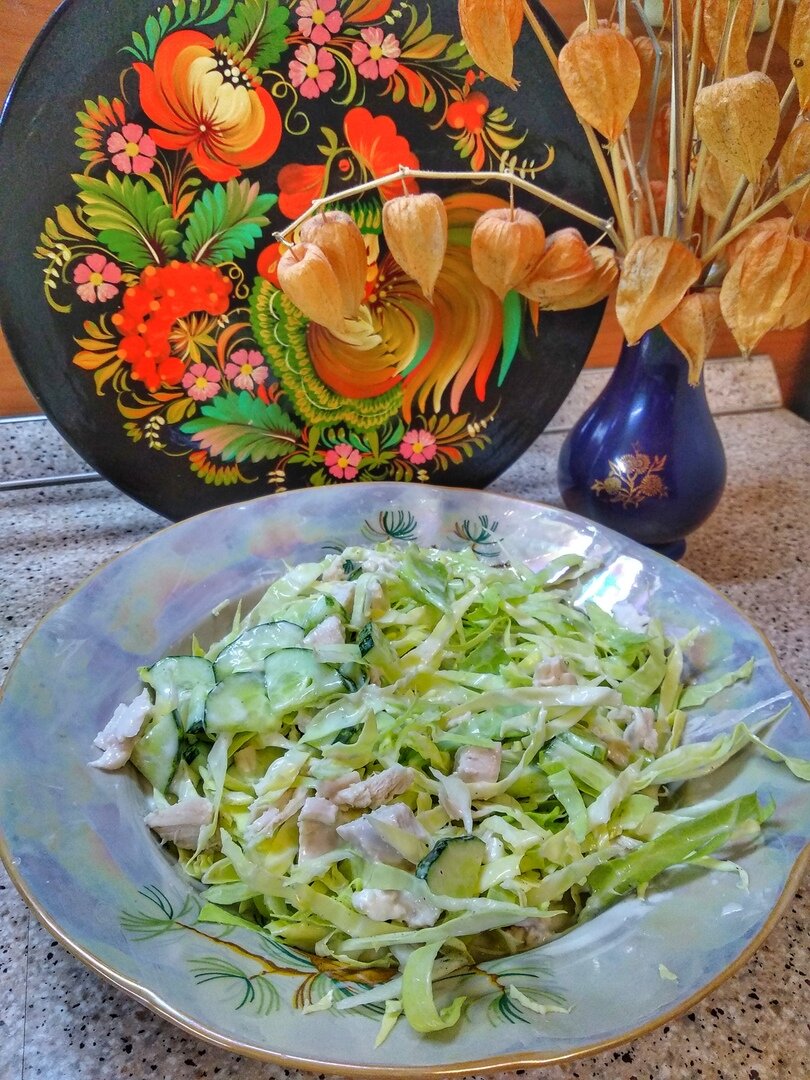 В летнее время, когда днем стоит парящее солнце, хочется приготовить что-нибудь легкое и в то же время сочное, вкусное и полезное. Я нашла для себя этот идеальный рецепт, который сочетает все вышесказанное и готова поделиться с Вами. Для приготовления нам понадобится - ¼ часть головки капусты - 1 большой огурец - ½ часть отварной куриной грудки - 100 мл кефира (2,5 %) - 1 ст. ложка лимонного сока - Соль, перец по вкусу Приготовление Шаг первый: капусту нашинковать, так чтобы она не была слишком мелкая (можно листья капусты без ножа порвать руками). Порезать огурец полукольцами. Куриную грудку нарезать кусочками среднего размера. Шаг второй: все ингредиенты смешать в одной таре. Перед подачей на стол вылить сок лимона и заправить салат кефиром. Добавить соль и перец по вкусу. Можно украсить салат веточками укропа или дольками лимона, гости оценят Вашу идею Вот такой простой и бюджетный салат будет пользоваться популярностью на вашем столе в летнее время. Оцените рецепт и ПОДПИШ