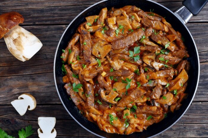 Здравствуйте дорогие мои читатели. Раньше у нас были коровы и каждую осень мы закалывали бычка. Мама раз в неделю готовила это блюдо нам , но только тогда , когда мы натоскаем грибов домой. Очень вкусное и сытное блюдо, мне было безумно вкусно и вам думаю будет аналогично!) ТУШЕНАЯ ГОВЯДИНА С БЕЛЫМИ ГРИБАМИ Что нам потребуется для приготовления? ИНГРЕДИЕНТЫ: 600 г говядины 300 г белых грибов 1 крупная луковица 2 зубка чеснока 150 мл сметаны 2 ст. л. томатной пасты соль и перец по вкусу растительное масло несколько веточек петрушки Ну что приступим! Первым делом нарезаем мясо соломкой, лук нарезаем полукольцами, грибы длинными кусочками, чеснок мелко режим. Далее разогреваем сковороду с растительным маслом и обжариваем мясо до светлого теста. Добавляем туда лук и помешивая обжариваем 15 минут на среднем огне. Теперь нам нужно добавить чеснок и через мину примерно грибы. Когда наши грибочки пустят жидкость, нужно посолить и поперчить, добавить сметану и томатную пасту , а теп