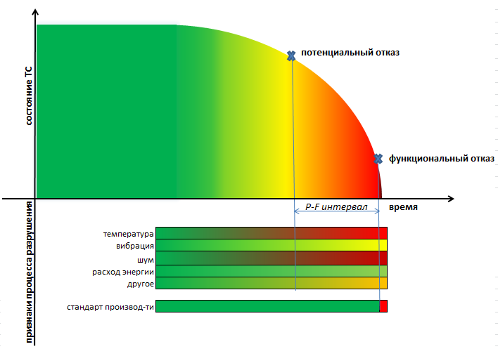 1. Cуществует очевидное состояние потенциального отказа. Иными словами, есть критерий (параметр или результат наблюдения) по которому мы можем предсказать приближающийся отказ. Это означает, что между потенциальным и функциональным отказом существует некоторый временной интервал. Его называют Интервал P-F.
