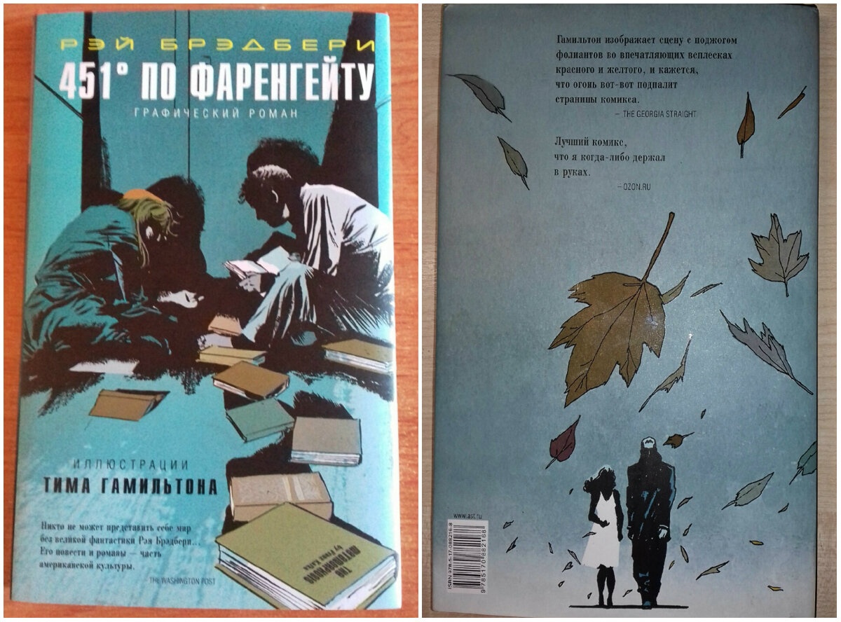 Это был подарок (А откуда еще взяться БУМАЖНОМУ изданию? :-) ), до которого долго не доходили ручки (бумажное издание, увы, не портативно :-( ). Графическая версия романа Рэя Брэдбери, иллюстрированная Тимом Гамильтоном. Первое, что стоит отметить, – издатели постарались на славу: снабдили книгу суперобложкой с объемными элементами (Возможно, по фото непонятно, но это листья, тома книг и заглавие); под супер- идет вот такая собственная обложка, контрастная по цвету. Оформление стилизовано под пламя пожара. Рисовка Тима Гамильтона не всем понравится из-за низкой детализации. Лица персонажей и окружение зачастую схематичны, внешность главного героя можно разглядеть далеко не на всех кадрах. Или так и задумывалось? Факт, к концу произведения лицо Гая Монтэга видно куда лучше. Что касается содержания, то думаю, здесь нет нужды его пересказывать – это прямое графическое переложение одноименного романа. Я пока так и не определилась, как относиться к комикс-версиям книг. Как показа