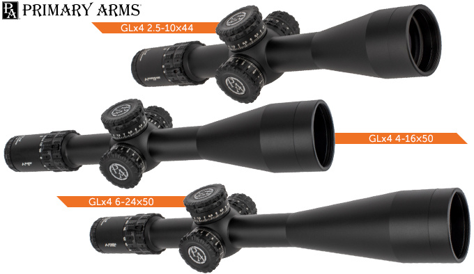 Primary Arms представили новую линейку оптических прицелов Gold Series (GLx4) с переменным увеличением, подсвечивающимися перекрестиями разного формата, которые расположены в первой фокальной плоскости, и четырехкратной оптической системой, на данный момент состоящей из шести моделей: 2.5-10×44, 4-16×50 и 6-24×50.