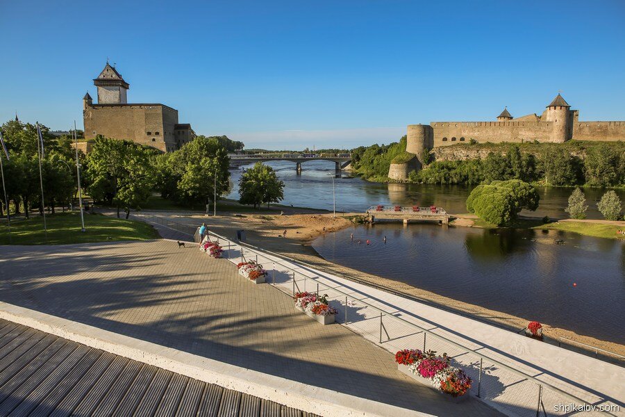 В России Ивангородская крепость, основанная в 1492 году: Туристы на башнях этих крепостей, кричат и машут соседям руками, здесь такое местн