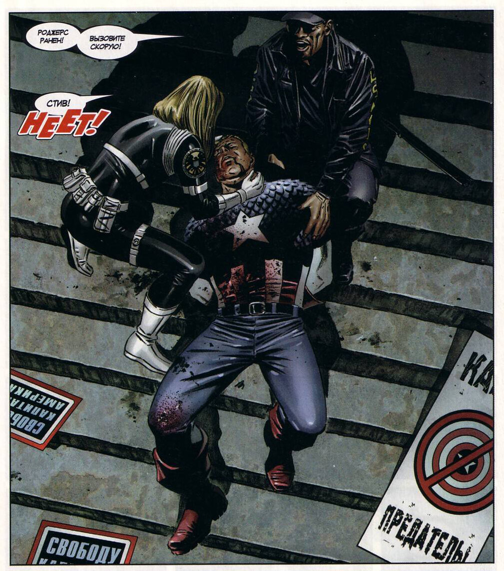 Стив Роджерс был застрелен перед зданием суда, куда его вели после того как он сдался властям. Стив не соглашался с регистрацией супергероев, что привело к конфликту с Тони Старком и положило начало гражданской войне. Когда война достигла массовых разрушений, Капитан понял что на самом деле его конфликт превратился в мировую драку, жертвами которой были мирные люди. После того как сдался Стив Роджерс, его заклятый враг Красный Череп планировал убийство. Он нанял Кроссбоунса что бы тот застрелил Капитана из снайперской винтовки, по дороге в суд. Кроме того дочь красного черепа внедрившись в Щит под видом психиатра Доктора Фаустуса, загипнотизировала Шэрон Картер и приказала ей, застрелить Стива Роджерса. Позже Капитан Америка скончался в госпитале... На прощании с Капитаном Америка собрались все и друзья и враги, потому что он стал легендой ещё за долго до знакомства со всеми. Так ушёл легендарный герой из вселенной комиксов MARVEL. Подписывайтесь на наш канал. Если вам нравиться такой