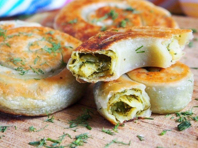 Здравствуйте дорогие мои читатели. Сегодня мы приготовим "Улитки" с зеленью. Что нам потребуется для приготовления? Ингридиенты: Кефир — 100 мл Вода газированная — 50 мл Масло сливочное — 50 мл Соль — 1 ч. л. Сахар — 1 ч. л. Мука — 200 г Укроп — 20 г Петрушка — 20 г Масло оливковое — 3 ст. л. Приступим! 1. В миске соединим кефир (комнатной температуры), газированную воду, растопленное сливочное масло, соль и сахар. Хорошо перемешаем. 2. Частями просеем муку. Замесим тесто, переложим в целлофановый пакет и убраем в холодильник на 20 минут. 3. Тем временем укроп и петрушку промываем, порежем и поместим в блендер. Добавим 2 ст. л. оливкового масла, по желанию — чеснок. Измельчим. 4. Через 20 минут тесто разрезаем на 7 частей. Каждую часть максимально тонко раскатаем. Смажем зеленым маслом. Свернем рулетиком. Затем улиткой. Аккуратно прижмем рукой или слегка раскатаем скалкой. Ничего страшного, если тесто немного порвется. 5. Обжарим лепешки с обеих сторон на сковороде, смазанной ол