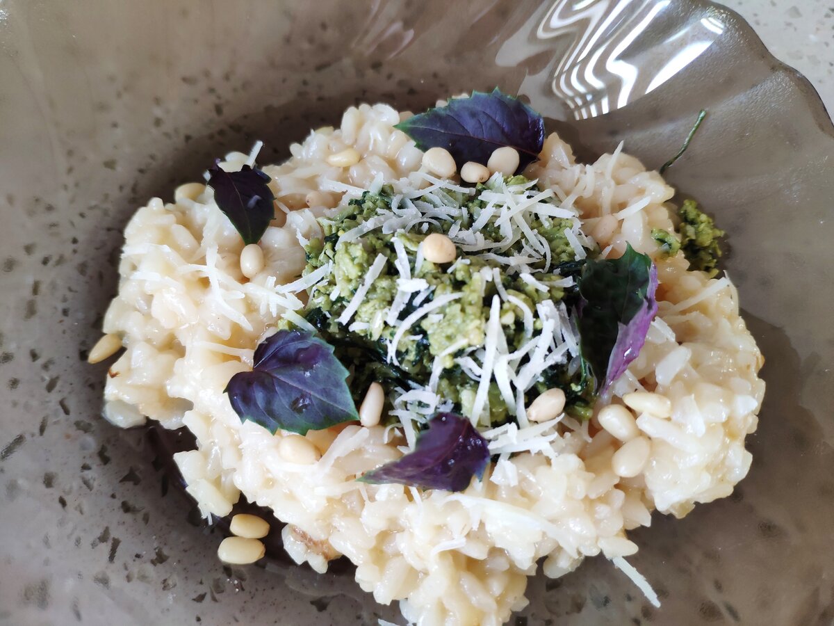 Сегодня я поделюсь с вами рецептом ризотто Бьянко с соусом песто. Недавно муж подарил мне кулинарную книгу Джейми Оливера с рецептами итальянской кухни. Я пробую готовить оттуда многие вкусные блюда, и это одно из них. Становится ещё интересней, когда у тебя годовалый ребёнок бегает по дому и делает всё, что можно и всё, что нельзя, а надо следить, чтобы лук не подгорел и рис не разварился)) Ну, что приступим! На 6 порций нам понадобится (для песто): · Горсть кедровых орешков · ½ зубчика чеснока, очистить и измельчить · Морская соль и свежемолотый чёрный перец · 3 горсти свежего базилика, только листья · Горсть свеженатёртого сыра пармезан · Оливковое масло extra virgin Для ризотто бьянко: · 1,1 л. бульона (куриного, рыбного или овощного) · 2 ст.л. оливкового масла · кусочек сливочного масла · Крупная луковица, очистить и измельчить · 2 зубчика чеснока, очистить и измельчить · ½ головки черешкового сельдерея, мелко нарезать · 400 г. риса для ризотто · 2 бокала сухого белого вина · Морс