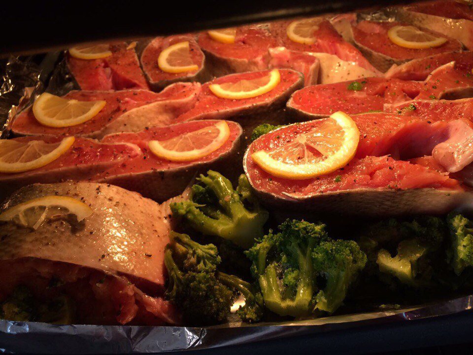 Итак, делюсь тем, что у меня получилось вчера из горбуши. Рецепт прост: замороженная брокколи или другие овощи, порезанная на стейки рыба, перец и лимон. (Брокколи надо или промыть заранее или разморозить, чтоб лишняя жидкость не образовалась, иначе рыба получится вареная). Запекаем всего 15 минут при температуре 230 градусов. (Все зависит от духовки, но главное - не передержать. В итоге получается хрустящая корочка и очень сочная серединка. Кстати, заметила, что заменив в еженедельном употреблении курицу рыбой, стали лучше расти волосы и ногти. Кто еще заметил какие-то изменения от употребления рыбы?