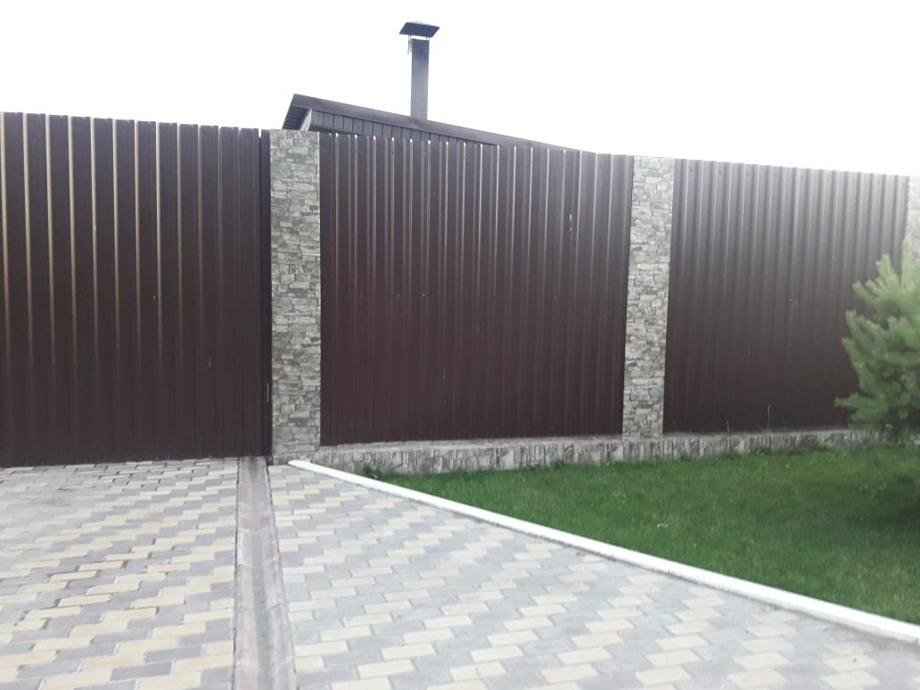 Кирпичная или каменная кладка на столбах и по фундаментной ленте забора всегда выглядит богато и со вкусом. Но, как всегда, есть но... это ощутимо скажется на Вашем бюджете. Что делать, если технический показаний, таких как подвижный грунт например, к такой конструкции нет, а очень хочется создать красивый внешний вид по фронтальной линии забора? Есть выход! Сегодня производители и подрядчики используют фальш- столбы в таких ситуациях. Это более бюджетно. Что такое фальш-столб? Фальш-столбы изготавливаются из плоского листа с полимерным покрытием под кирпич или каменную кладку. Из такого листа гнутся короба, которыми закрывается основной металлический опорный столб, сверху ставиться колпак. Способ крепления коробов зависит от типа основных заборных секций. Аналогично изготавливается и фальш-лента. обращайте внимание на толщину используемого листа - лучший вариант толщина 0,5 мм - такая конструкция будет более надежна и менее подвержена деформации. Образец забора с фальш столбам