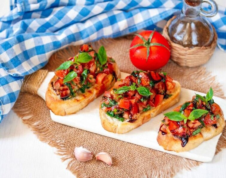 Брускетта исторически относится к поджаренному итальянскому хлебу, пропитанному оливковым маслом и подаваемому с чесноком или помидорами, но в наши дни большинство людей имеют в виду только начинки, когда говорят о брускетте. ИНГРЕДИЕНТЫ 8 кусков поджаренной чиабаты или багета 200 грамм грунтовых помидора мелко порезанных (я неравнодушен к помидорам черри, но используйте то, что вам нравится!) 10 грамм свежего зеленого базилика мелко нарезанного 15 грамм оливкового масла 10 грамм бальзамического уксуса 3 грамма чесночной соли ИНСТРУКЦИИ Положить помидоры и базилик в миску, сбрызнуть оливковым маслом и бальзамическим уксусом. Посыпать чесночной солью. Попробуйте и отрегулируйте пропорции по мере необходимости. Наслаждайтесь! Совет Чесночная соль - Вы можете использовать обычную соль и свежие зубчики чеснока, если хотите, но я считаю, что чесночная соль работает хорошо и вам не надо беспокоиться, что на зуб будут попадаться кусочки чеснока опционально : красный лук - немного рубленого