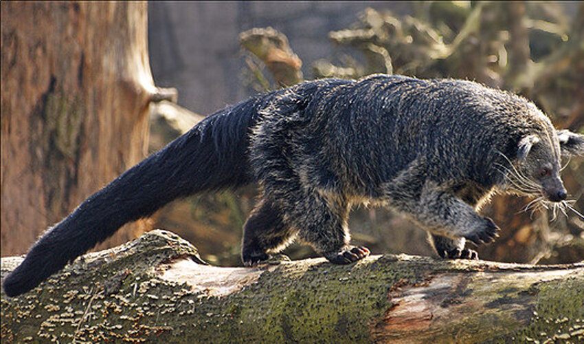 Животный мир не перестает нас удивлять, и сегодня мы расскажем еще об одном необычном творении природы! Представьте себе диковинную зверушку, которая выглядит так: кошачья морда, тело медведя, размер средней обезьяны и огромный хвост. Скажете, что какой-то селекционер скрестил несколько зверей, чтобы получить такое чудо, совместив несовместимое? Нет. Это животное создано самой матушкой-природой, и человек к этому не прикладывал рук. Герой сегодняшней публикации – бинтуронг. Иначе медвекот, или медвежья кошка. Где обитает это чудо? Живет медвекот в тропических лесах Юго-Восточной Азии и крайне редко встречается в дикой природе. Это еще один зверь, который ой как любит высокие деревья, и совсем не любит с них спускаться. Порой, рассказываешь вам о каком-нибудь интересном звере, обитающем на верхушках деревьев, и невольно задумываешься: а чем же там так хорошо? Может, мы чего-то не знаем? Но, как показывает практика, и как доказывают ученые, все милые и пушистые прячутся в густых зарос