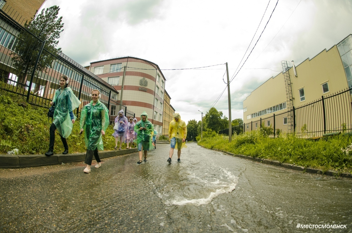 Первый — «Карманный Смоленск» — своеобразная аудиоэкскурсия по городу. Очень полезная, если ты в Смоленске в первый раз, а для тех, кто прожил в городе всю жизнь, может открыть его по-новому. В основе спектакля — записи голосов жителей, прошедших по этому маршруту ранее и поделившихся своими воспоминаниями о городе 70-х или 90-х, вперемешку с историческими фактами. Возможность взглянуть на город глазами другого, узнать его в историческом разрезе и соединить со своим личным отношением к Смоленску. Проводник фиксирует внимание на точках, о которых идет речь, повторяет действия, подолгу стоит на одном месте, давая возможность не только изучить конкретное здание, но и всмотреться в окружающее пространство. Для меня этот спектакль стал знакомством с городом, который предстал местом с постоянно пульсирующей исторической памятью, городом, в котором на развалинах былых эпох проходили студенческие тусовки 90-х, и эти самые развалины сейчас бесконечно реставрируются (или нет) за заборами. Финал спектакля проходит на Площади Победы, где, в окружении крепостной стены XVI века и неработающего советского кинотеатра «Октябрь» с обосновавшейся внутри ярмаркой, зрители обходят вокруг памятника защитникам Смоленска, зацикливая войну до бесконечности. Ритуальное зализывание исторических ран, идолы-солдаты былых эпох и современный театр, пришедший в родной город на правах гостя, — все это про какую-то иную ментальную карту города.